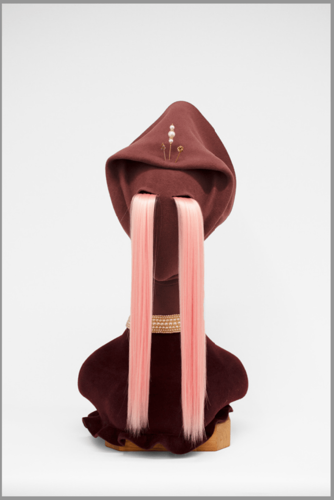 Felt, synthetic hair, resin, brass, crystal, wood, cotton