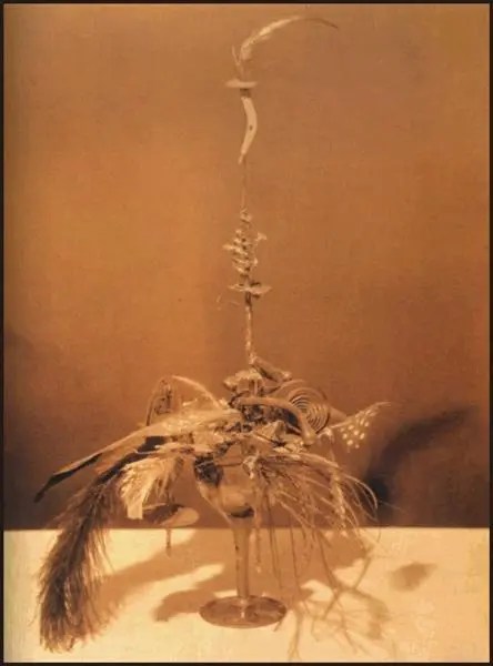 One of Elsa’s assemblages directly references Marcel Duchamp. The piece called Portrait of Marcel Duchamp consists of a champagne glass filled with bird feathers, wire coils, springs, and small discs. The New York art critic Alan Moore praised von Freytag-Loringhoven’s use of non-traditional media and said that her best-known sculptures look like cocktails and the underside of toilets.