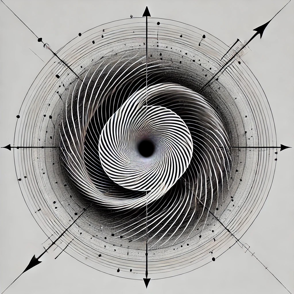 Prompt — An abstract visual representation of a naked singularity, depicted as a central, infinitely dense geometric point surrounded by concentric curves and spirals that distort and break at irregular intervals, symbolizing instability and the breakdown of physical laws. The figure is monochromatic, entirely black-and-white, with no gradients or shading. Straight arrows and warped trajectories intersect in chaotic yet symmetric patterns, conveying gravitational pull and spacetime curvature. The background is empty and featureless, highlighting the singularity as a standalone concept. Created using: minimalist design, mathematical precision, high contrast, symmetry and asymmetry blend, line art style, abstract geometric visualization, theoretical physics inspiration, and hd quality –ar 1:1.