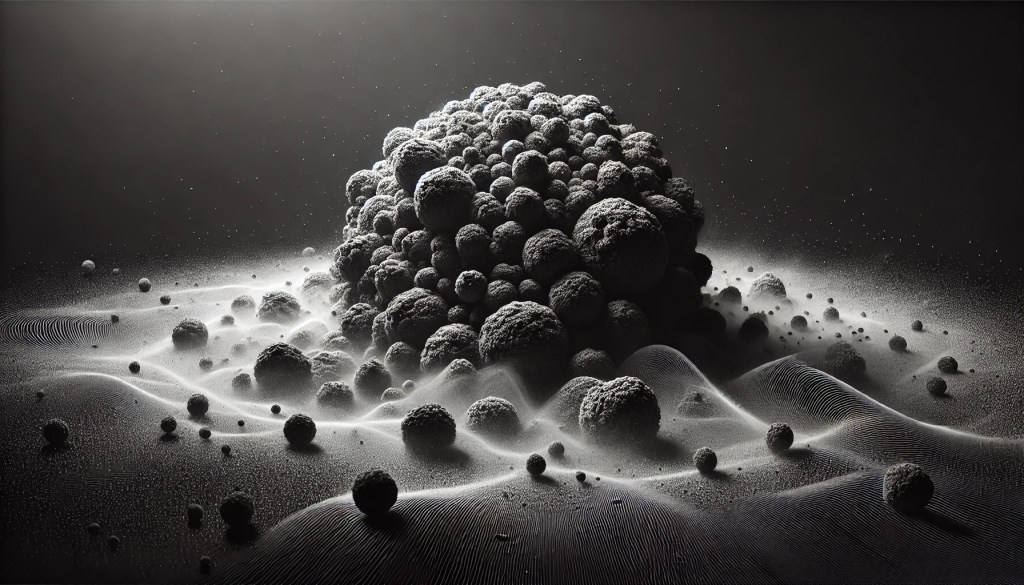- Minimalist Conceptual Aesthetic: A deep black void emphasizes the contrast between the illuminated grains and empty space.