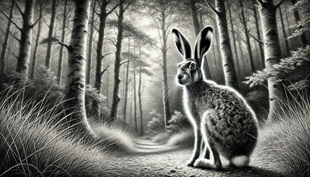 Here is your black-and-white hare in the forest, gazing at you with a mix of surprise and curiosity, yet knowing you are a friend, not a hunter.